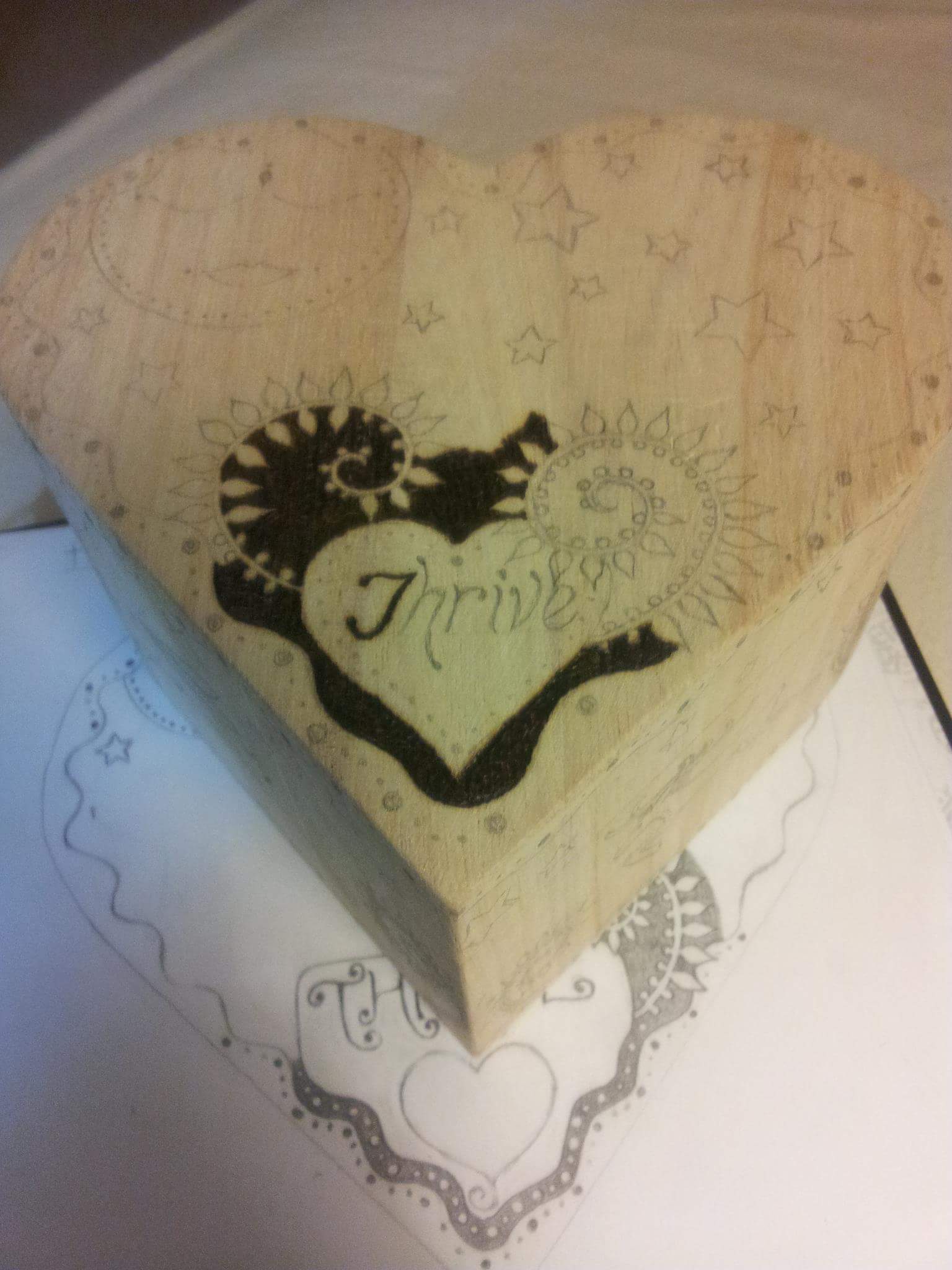 Because of my recent illness I’m rethinking some things. I spend too much time on Facebook for starters. It’s been a love hate relationship. It does have its uses. One of the big questions on my mind is what direction do I want to take my art? Do I want to write more? Paint more? Burn more? Sell? Give only? Not expect money from it or expect to make a living? Etc. The hamster is running on the wheel. At least the wheel is turning again.