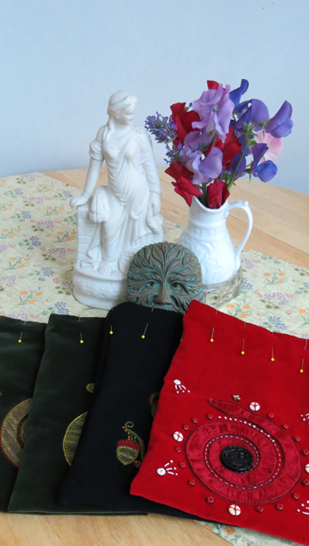 Recently, the Witch of Forest Grove posted a photo of her tarot deck in a lovely still life image on her Facebook page. In it was a pouch I made that she eventually made hers.  This photo manifested 4 new custom bags.  It can be a challenge when someone wants one “Just like hers” when my goal is to make sure everyone gets something at least a little bit unique. Luckily living in the now and letting the organic process flow makes it easier and also I’m not who I was when the first bag was created and so my style has shifted.  There are similarities but the differences are there too.
