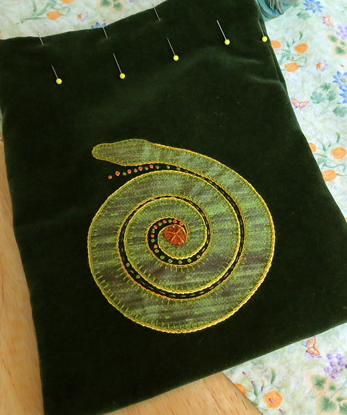 I’ve finally got the pie pieces connected to each other and have the central motif of the sun and moon begun.  Each section will be separated by a green velvet ribbon.  It will be backed with green wool felt and have, in each corner, an embroidery of an element (earth, air, fire, water).  I’m really getting close to completion and once again I’m excited about it.