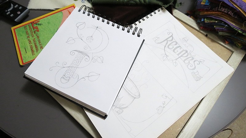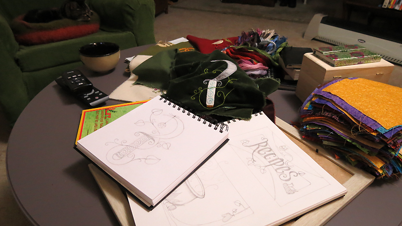 So, here is another teaser for items to come in the Etsy shop. I gotta come up with the money for all this, right? You can see here another unmentioned project, my Samhain quilt top… Probably not ready until next Samhain, just in time to move to my new digs where ever they may be. The pouches, Miss Mitty in her felted bed, a wooden box that will be the recipient of the recipe design on the sketch pad, and finally, one of the new pouches, both in fabric WIP and in sketch… Life is good. Now if only the small staph infection that is on the END OF MY NOSE would heal, things would be perfect. Must have caught that from one of the unclean, unwashed masses at the yard sale. Jeesh.