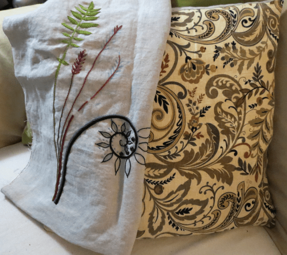I saw this yummy printed linen/rayon fabric at Joann’s about six weeks ago and I knew it was perfect for the autumn pillow covers. I had some unbleached linen that would go great on the back (I’m a total fan of being able to use the backs as art too) and this project was born. Thank goodness I have a year!! I have made a vow that all my pillow covers will have zippers from now on too, instead of whip stitching them closed. Goodness that made a quick clean challenging.