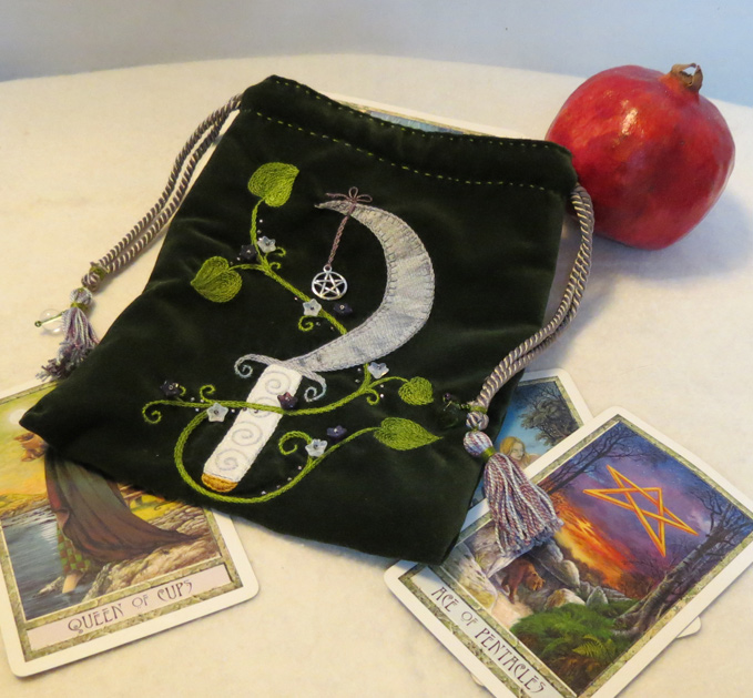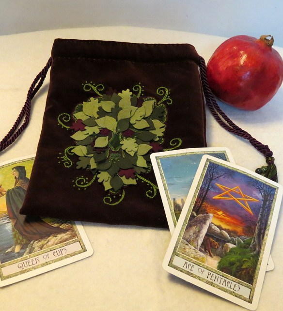 Greenman Tarot Bag – Cotton velveteen lined with silk, embellished with faux suede leaves for a lovely 3-D effect. The hand made tassels are beaded with bloodstone and serpentine.