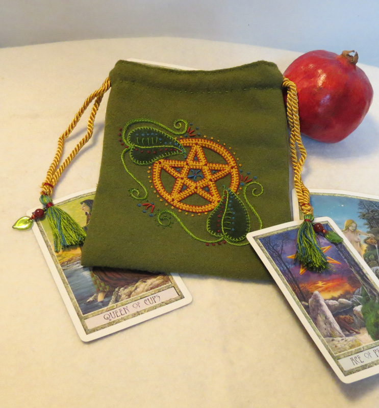 Pentagram Tarot Bag – woolen bag appliqued with velveteen leaves and a wool pentagram this bag is beautifully hand embroidered and line with silk. The hand made tassels are beaded with glass and carnelian.