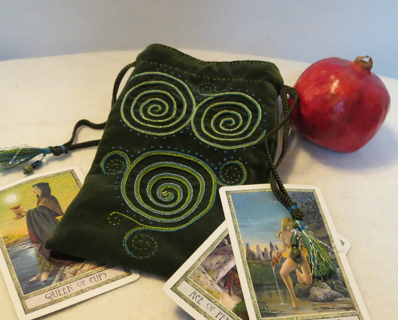 Spiral Tarot Bag – Cotton velveteen bag, lined with silk, is hand embroidered with perl cotton and metallic threads, a silver pentagram bead in the center of the largest spiral. The hand made tassels are beaded with serpentine and quartz crystal.