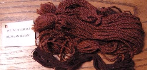 The colors I show you here in these pictures are the results of that day of dyeing. You will note that the larger bundles of wool have a slightly different shade than the smaller crewel wools. We could only attribute that to the difference in modern manufacturing and fiber processing. They both started out the same color, winter white. I have done my best to make sure that the colors you see in the monitor come as close to what I see with my naked eye. Your monitor might show color variations. You will also note that next to each wool sample is a little card that I made that day showing how many times a fiber was dipped into which dyes, if there was a mordant used, and if there was an ammonia bath or not.