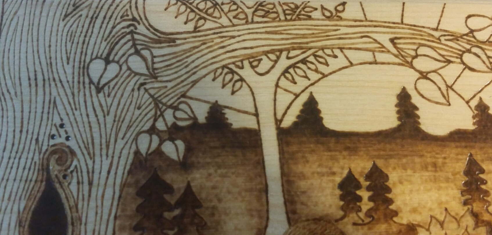 What follows are a few photos as I moved through the process from photo to pencil design to transfer to wood burning and coloring. Please enjoy!
