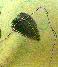 The french knot is an easy stitch that can be used to highlight or fill in areas. In the demonstration photos I am using it as a border along a leaf vein. The one thing you must make sure you do to ensure a perfect french knot is to make sure your needle goes down at B not at A. If you insert your needle into the same hole it came out of, A, your knot will be a knot and pull through the back of the fabric and you will have to tie off and begin again. When you are using fabrics without large holes in the weave this is easier to accomplish. If you are using an even weave fabric like linen for cross-stitch, make sure to enter the fabric one thread over from where the needle exited at A.