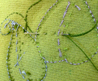 I like to bury my threads in the back of my work as often as possible. You can see that I do tie a knot at the beginning (to the left and below the point of the needle in the photo). When I’m done with the color I’m using or have completed my motif, I bring my needle and thread to the back of the work. Doing a shallow running stitch (make sure you don’t pierce the motif and have your knot show in the right side of your work) I work the needle through the ground fabric a couple stitches. |