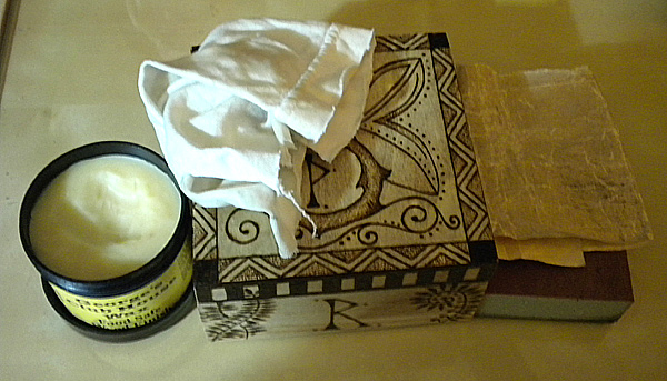 FinishingTime to sand again. The moisture from the varnish or finish can raise the “tooth” of the wood which causes a bit of roughness and which needs to be smoothed out so I usually sand in between applications. When I’ve colored the box, I like to use a non-toxic sealer for decoupage and am careful not to bleed certain colors, especially reds, but paint certain sections by themselves. I will varnish all the white first, then the dark colors until the first coat is done. I only need to be this careful on the first application. If you are not coloring the box and leaving the wood clean you can also use a few thin layers beeswax rub. With plain wood, I usually give it 3-4 thin coats with a light sand in between. This is a method I love. It leaves a nice not too shiny sheen, it’s non-toxic, and darn it smells good. The box smells good after beeswax, like honey on a summer day, yummmm. Love this. |