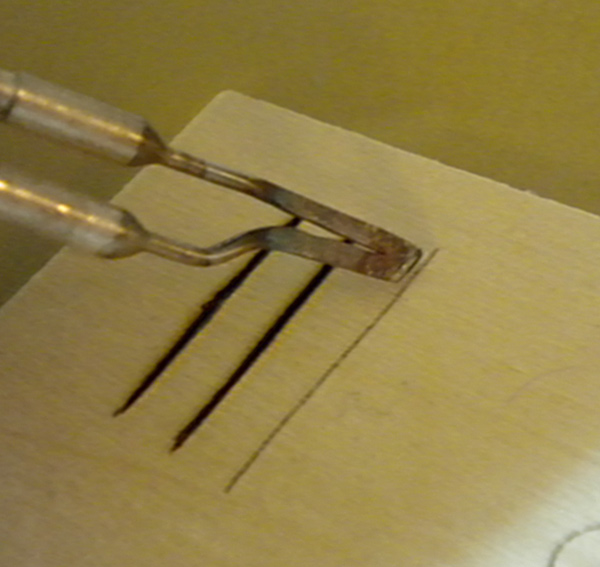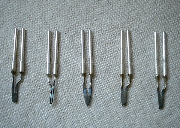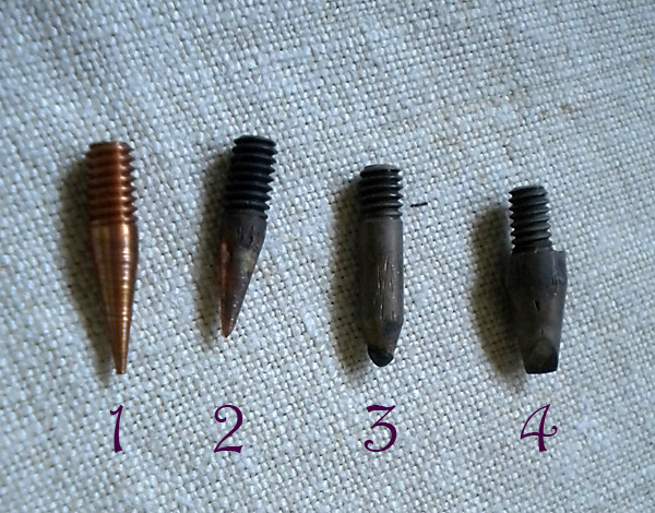 These brass and copper tips are no match for the heat required. Tip #2 looked like tip #1 one project earlier. Significant copper was lost. There was also the problem of the long pointed tip burning too fast in soft wood and creating a deep pit. #3 was less pointed but less accurate. The most successful of these tips, #4 worked fairly well but it wasn’t sharp enough or precise enough either. I very quickly outgrew this machine and moved on to my favorite, my baby… |