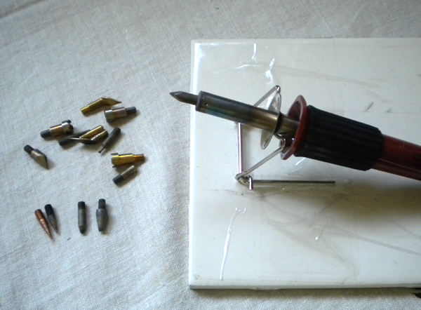 I started out with a burner I got at a local craft store for $10. I almost immediately progressed to their deluxe model that provided interchangeable tips as well as some other options such as a soldering tip. It came with a little folding holder which I taped to a ceramic tile. It was a bit unstable as the weight of the cord and the on/off switch had a tendency to pull it out of alignment. |