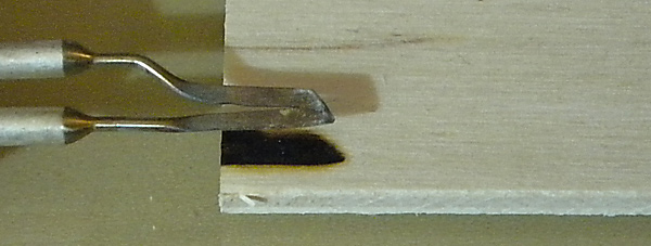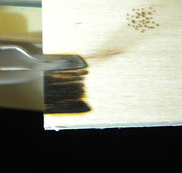 Fill burnPress the flat against the wood until a tendril of smoke rolls. Move and repeat. If you aren’t burning at an edge, I turn the blade 90 degrees and pull slowly like a straight stroke above in wide stripes. |