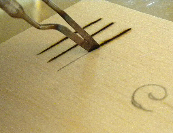 Straight LinesI press down and then slowly draw the point towards myself in even pressure. You will need to notice if you are dealing with a heavily veined wood and adjust as you cross from soft to hard to soft… I always test the tip by making a couple test burns on the bottom the piece. Sometimes I mark my name, sometimes I make random marks and cover them later with felt to pad the bottom and keep the piece from damaging furniture. |