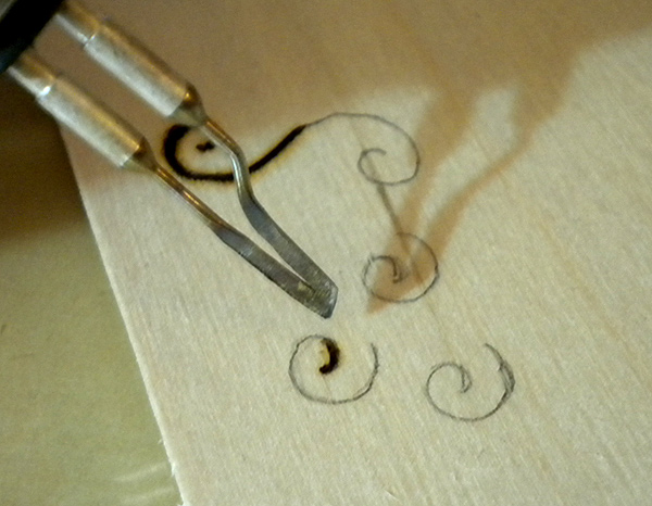 Curved LinesI burn curved lines in small short strokes, turning the piece as I work around. Note in the images below that board is turning in relation to the placement of the blade. I use the point of the blade. This can take some practice and I recommend you do so. |