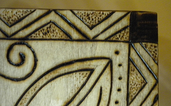 Some folks have the space to dedicate to their arts and hobbies, some do not. Make sure your workspace is comfortable and safe. I admit that my idea of this is not in sync with many. I approach my work very casually and admit to clearing off the coffee table (glass topped) and getting to it while sitting on the floor. I’ve been known to curl up on the couch with a box in one hand and the burner in the other, the long cord makes this easy. I’m a rebel. You may feel you need a work table and chair, some get really in to it and have easels and all kinds of accessories. I keep the work in my hands so that I can turn it easily (which really helps with curved lines). I like a good light source close by. Whatever you currently use, be it the kitchen table or the full blown artists space, be safe, be comfortable, and above all, have fun! Did I say I love the smell of the tendrils of smoke up my nose. Many folks say to burn in a well-ventilated space. |