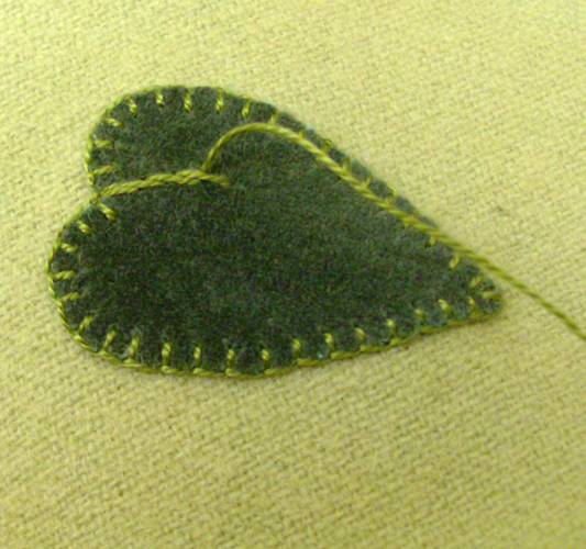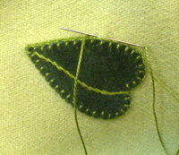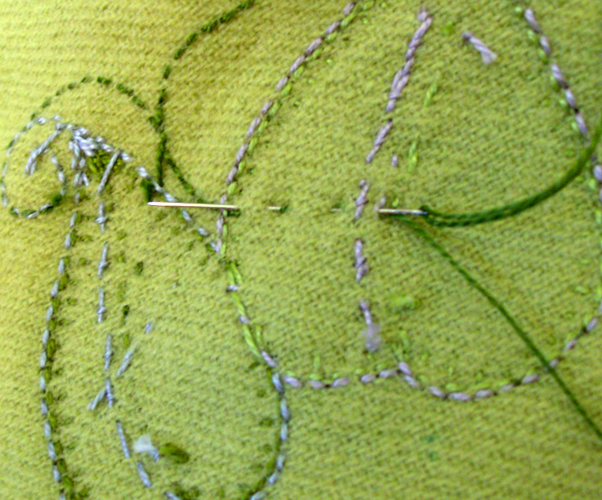 Stitching over a drawn line. Note that you can see that I tend to give my leaves and branches a bit of a point effect using the stem stitch and a straight stitch to fill in the point. |