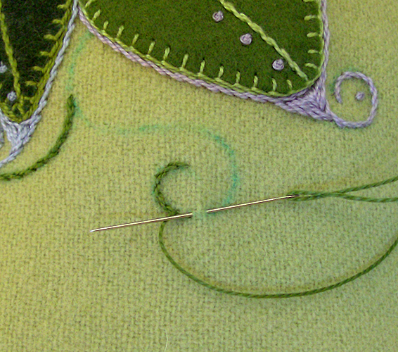 The Tie Off: I like to bury my threads in the back of my work as often as possible. You can see that I do tie a knot at the beginning (to the left and below the point of the needle in the photo). When I’m done with the color I’m using or have completed my motif, I bring my needle and thread to the back of the work. Doing a shallow running stitch (make sure you don’t pierce the motif and have your knot show in the right side of your work) I work the needle through the ground fabric a couple stitches. |